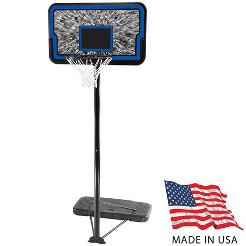 Lifetime's 1259 Portable Basketball Goal System includes a 44-inch black rectangular impact backboard that is screen printed with UV-protected inks, offering fade resistant color. The folding rim designed to withstand today's style of aggressive play features welded-steel net hooks that help avoid the annoyance and danger of dangling net loops common in cheaper rims. The Streamlined portable base rolls to any desired location, and is constructed of high-density polyethylene to withstand the elements. The system includes a three piece hammer-tone steel 2.75-inch round telescoping pole system.